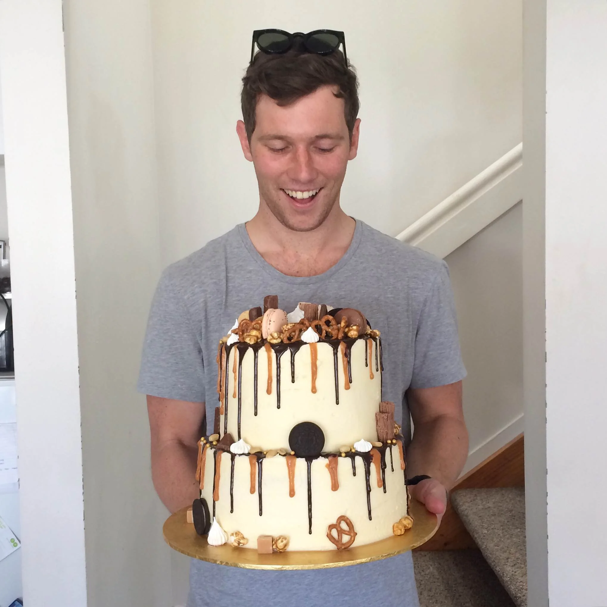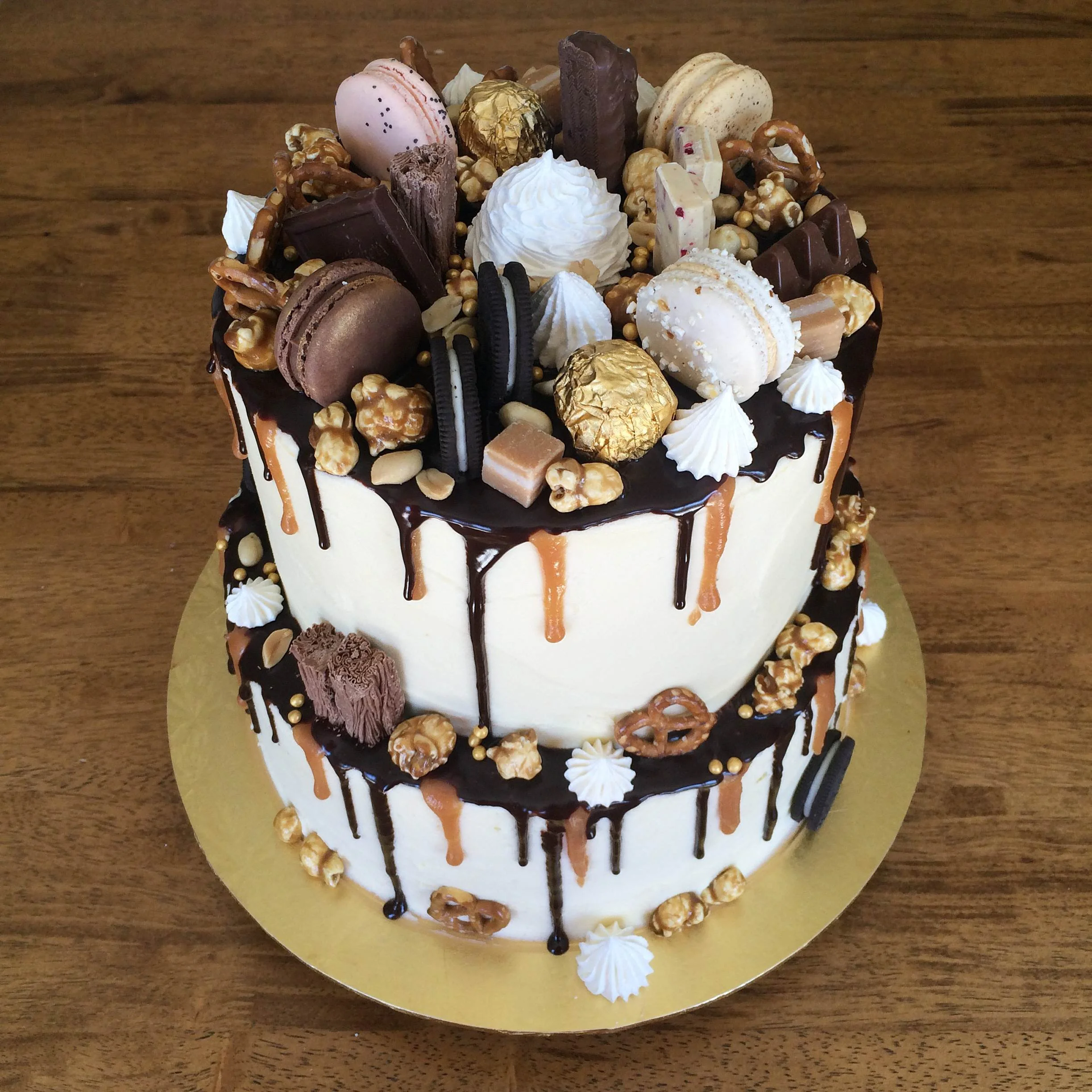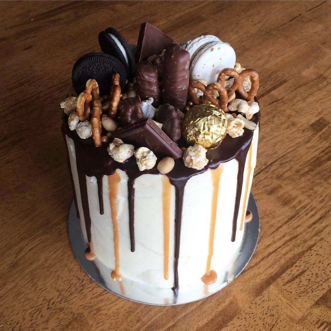 With salted caramel and peanut butter of course. Three extra moist layers of rich chocolate cake sandwiched together with lush vanilla buttercream and Small Batch peanut butter. Features include the salted caramel drizzled down the side and the endless opportunity to decorate with your favourite caramel and nutty candy bars.
