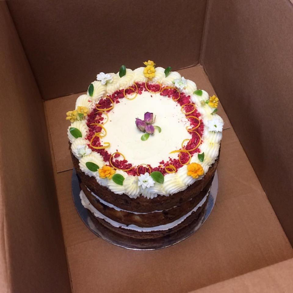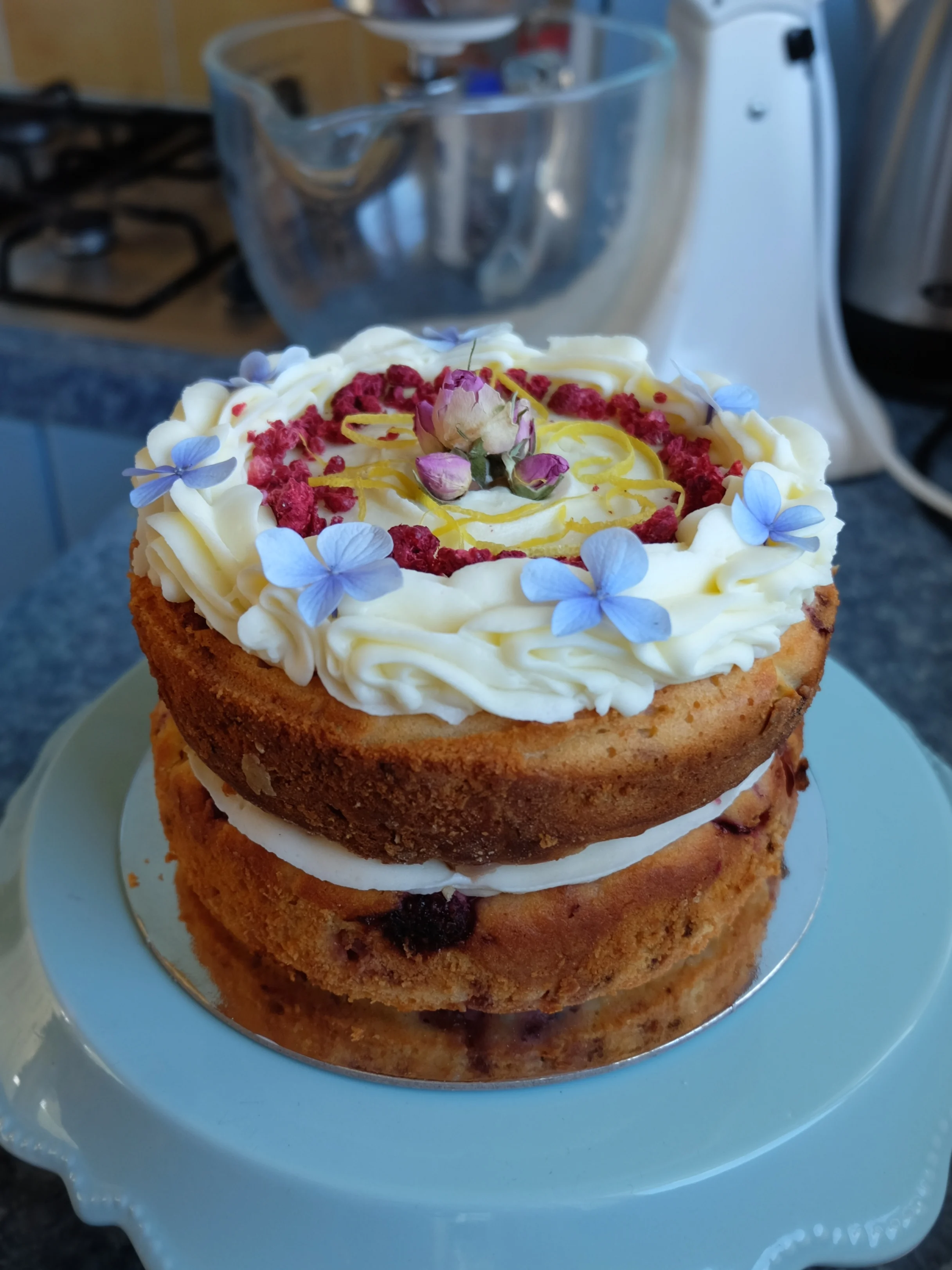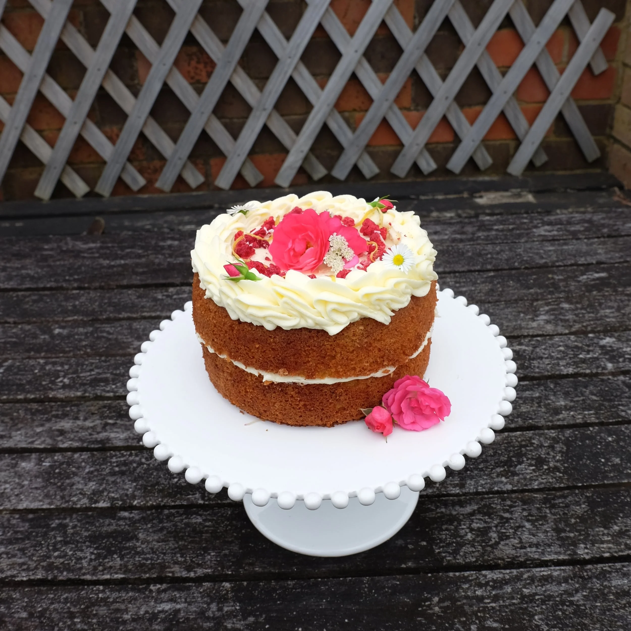 Two 15cm layers of lush coconutty and raspberry glory sandwiched together with cream cheese icing with a hint of lemon.