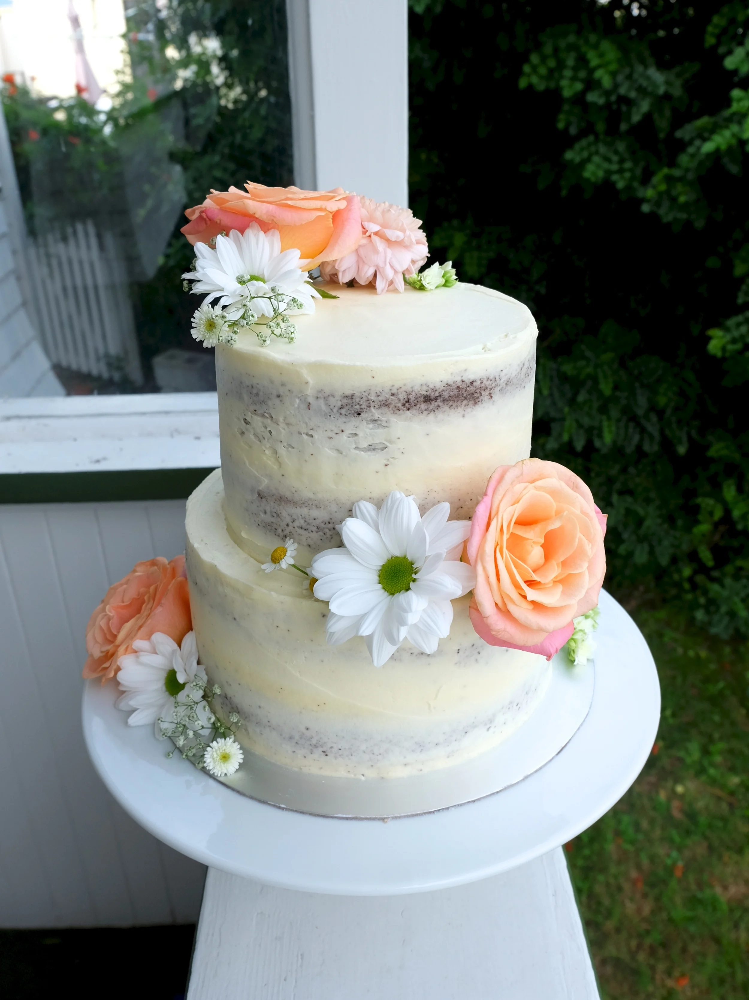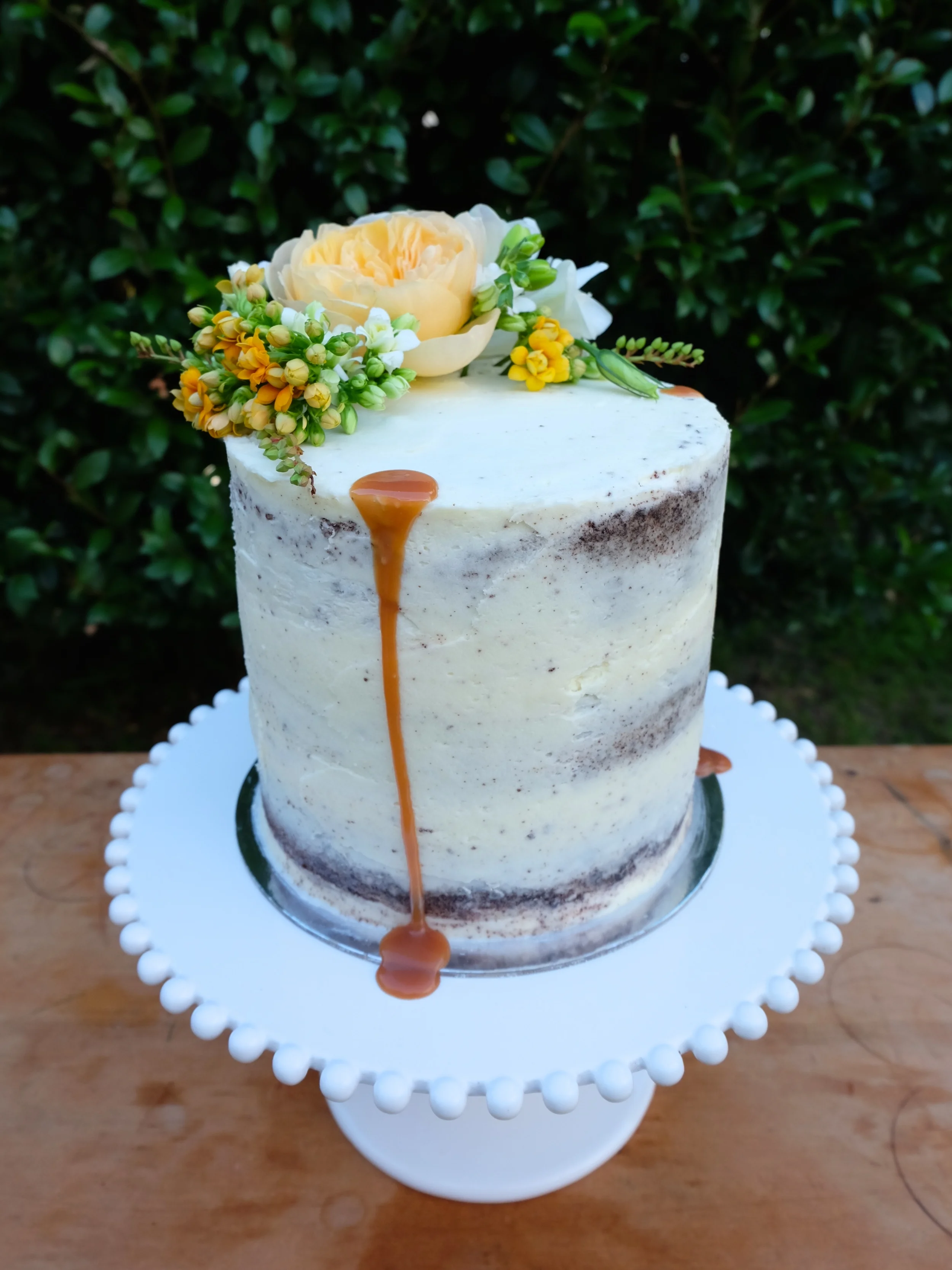 Three layers of moist chocolate cake with salted caramel in between, iced with vanilla buttercream and decorated with fresh blooms (subject to season).