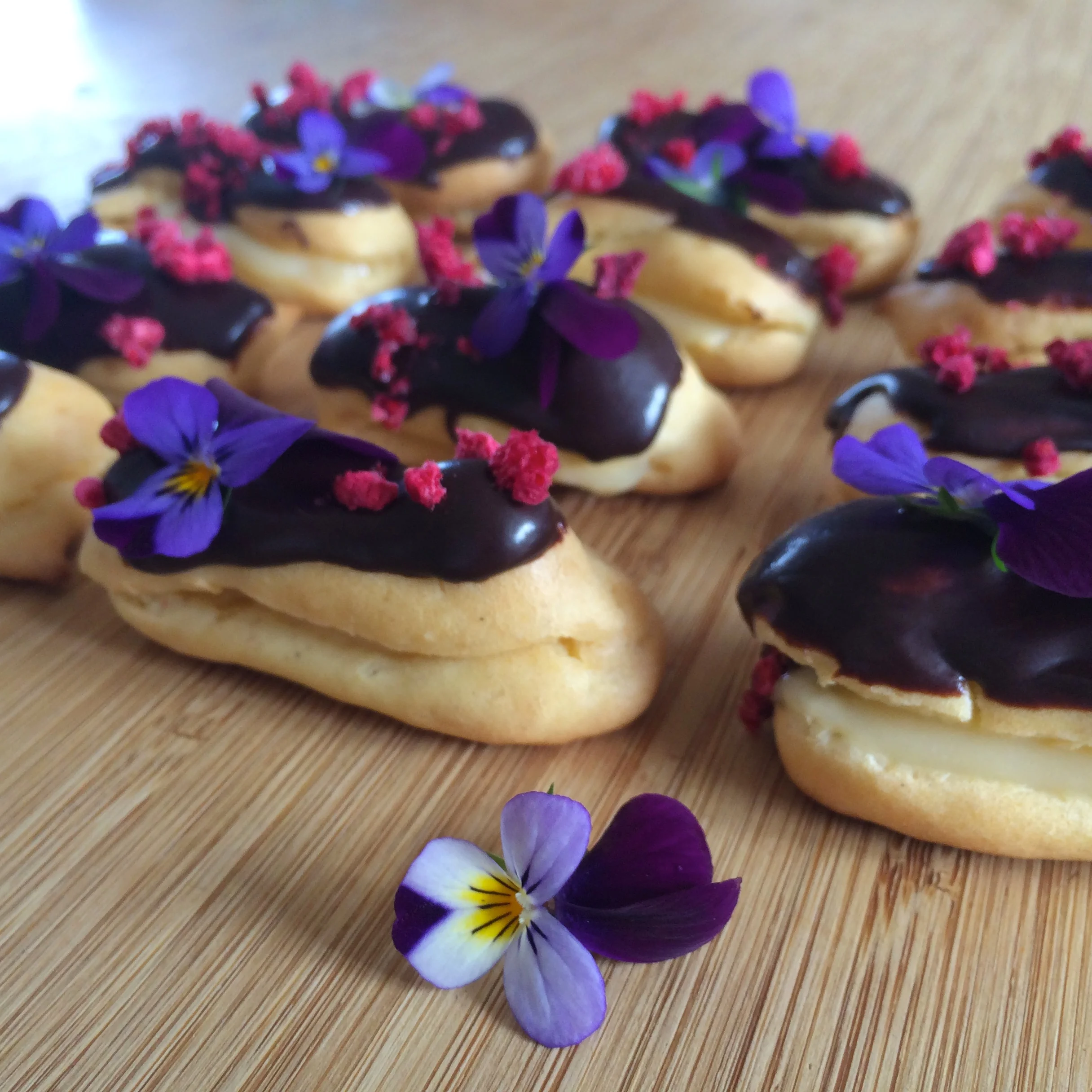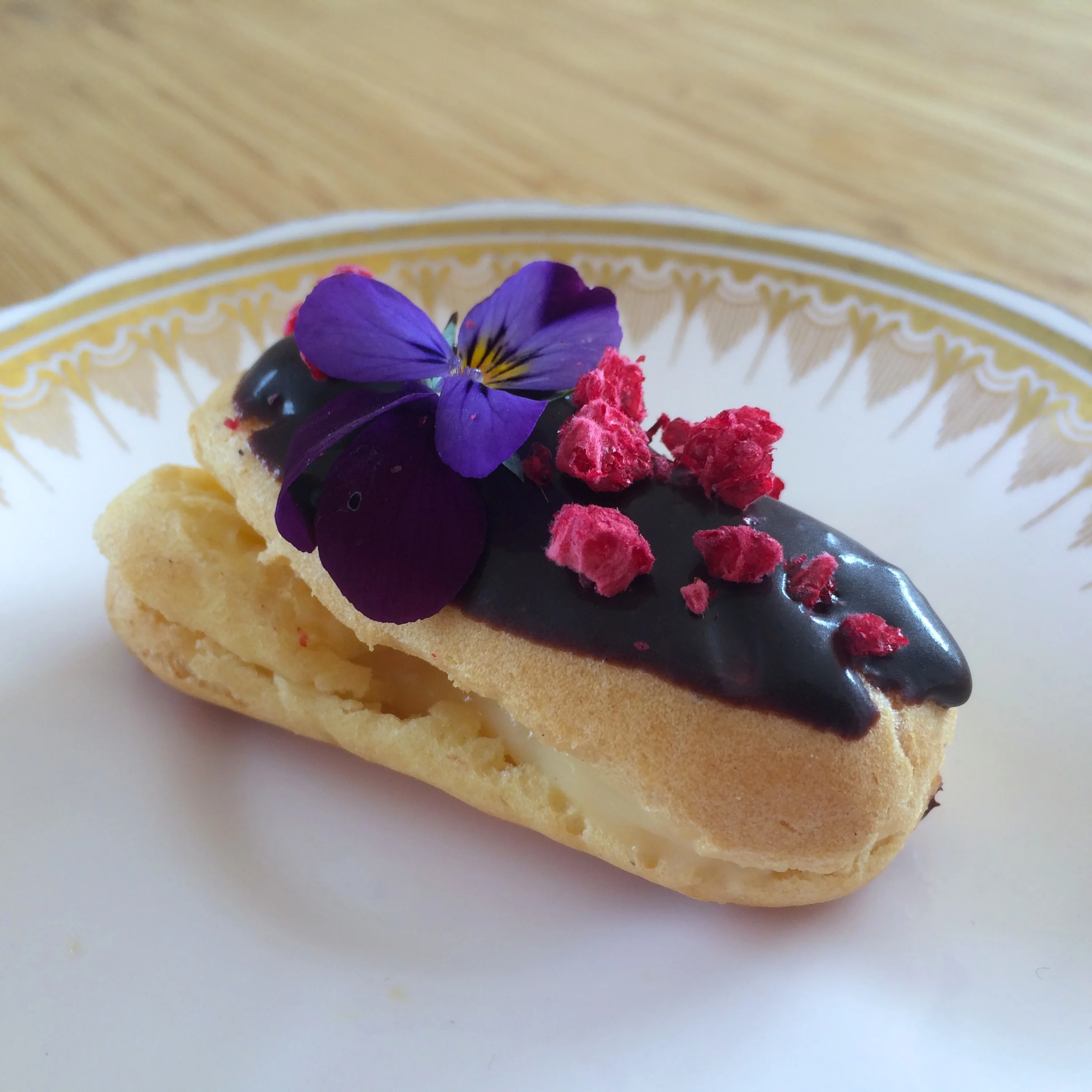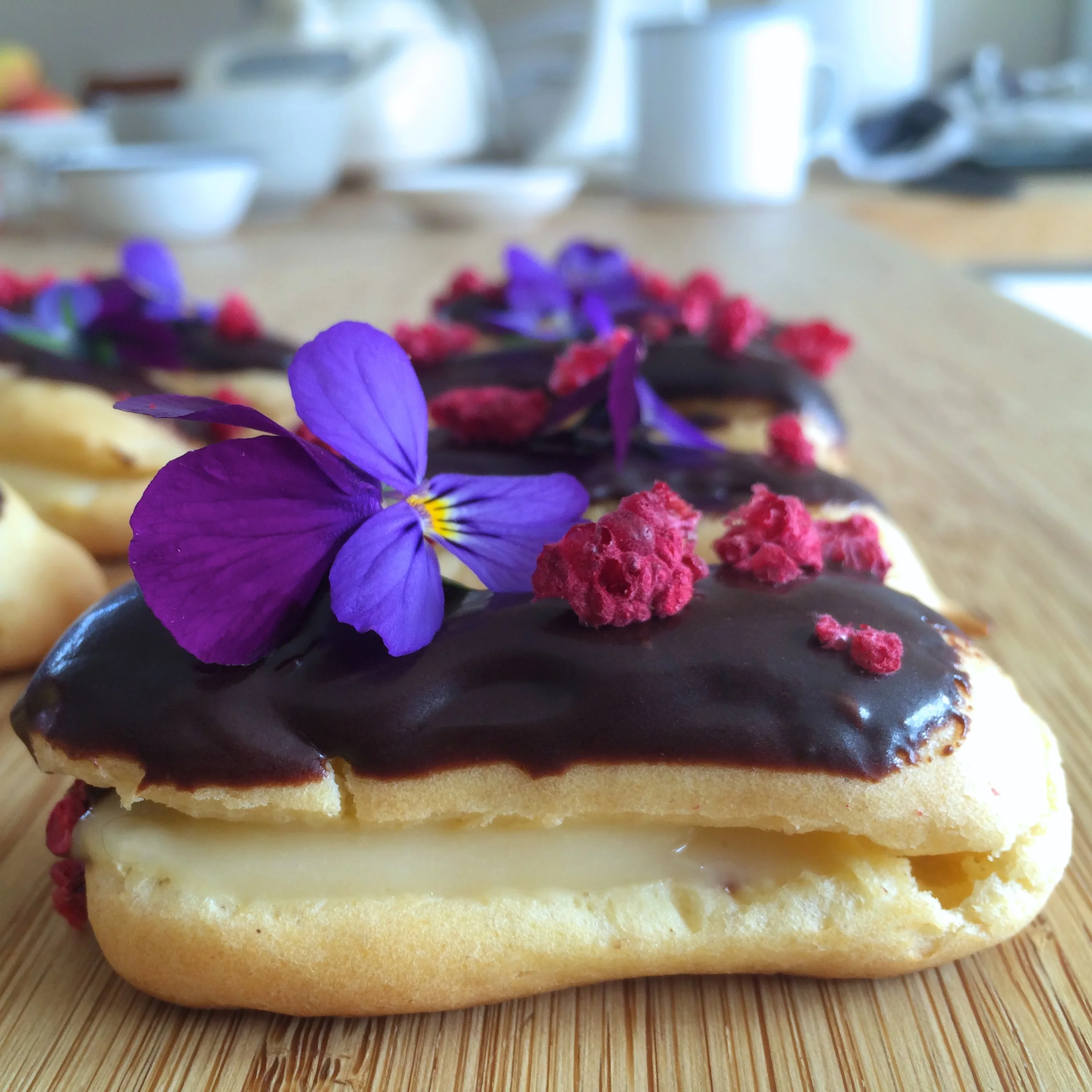 Using a piping bag, fill the eclairs with a line of cold custard. Carefully dip each eclair into the chocolate icing, use your finger to spread it around if it needs it. Decorate with a sprinkling of crushed, freeze dried raspberries and a flower. Keep refrigerated until serving time.