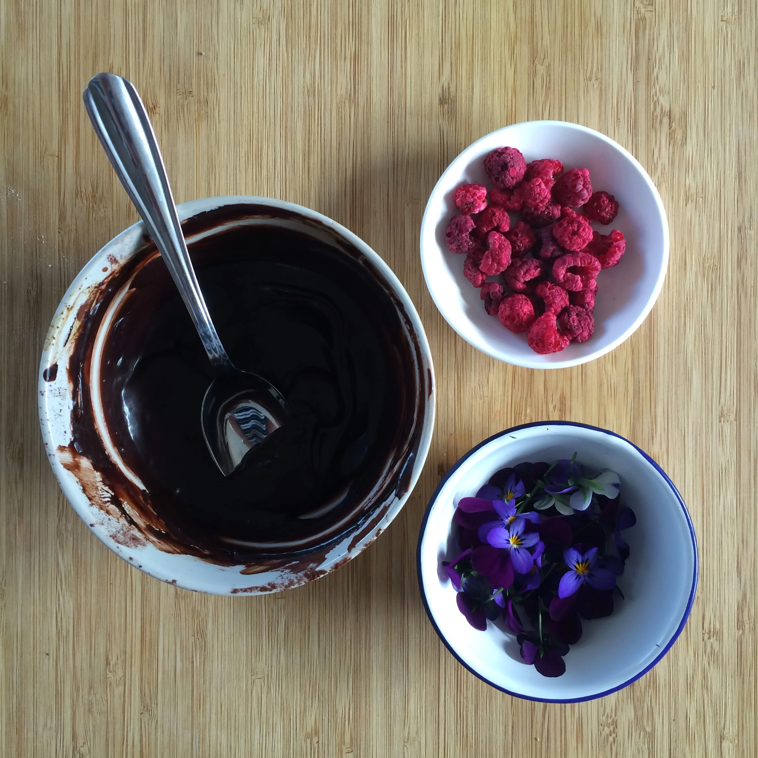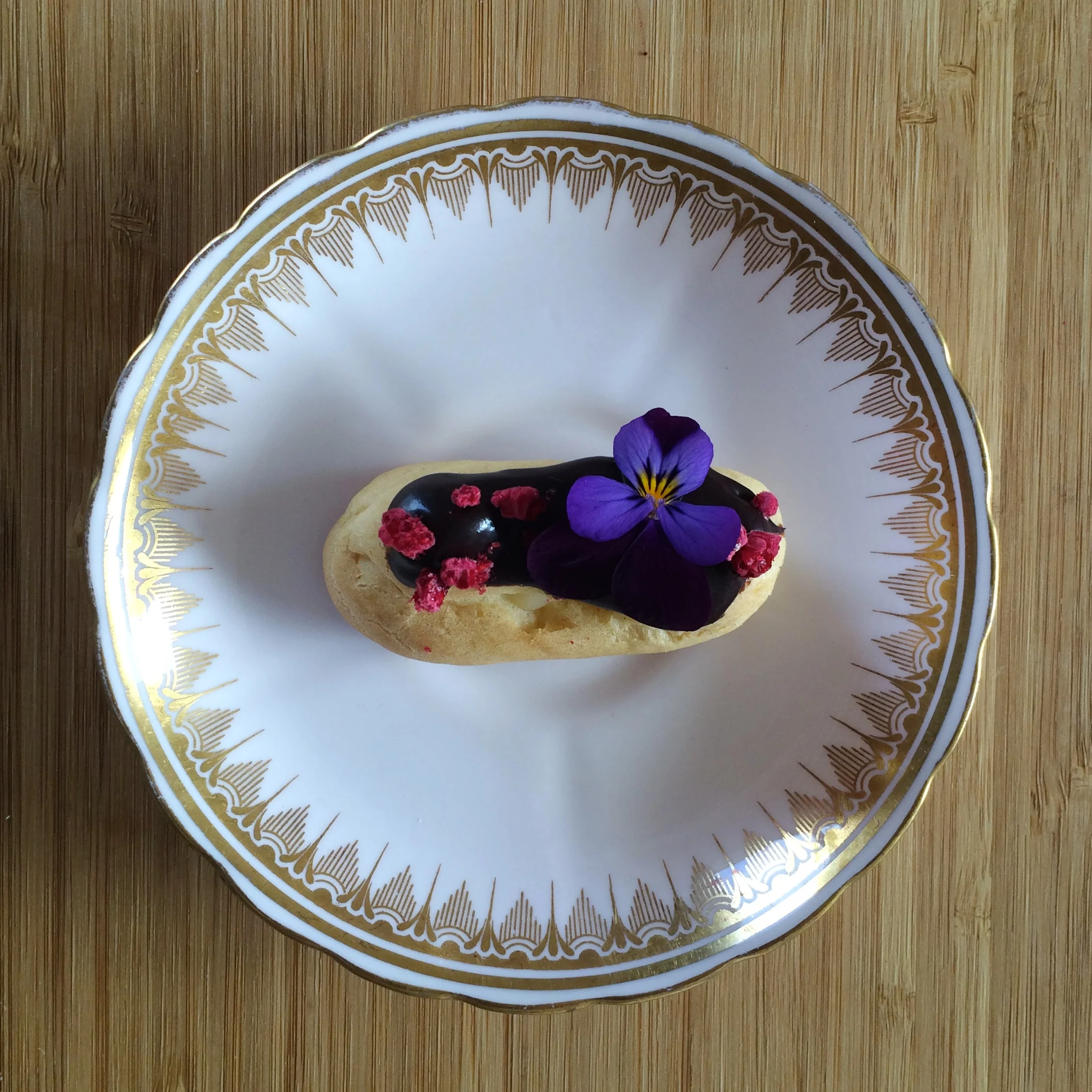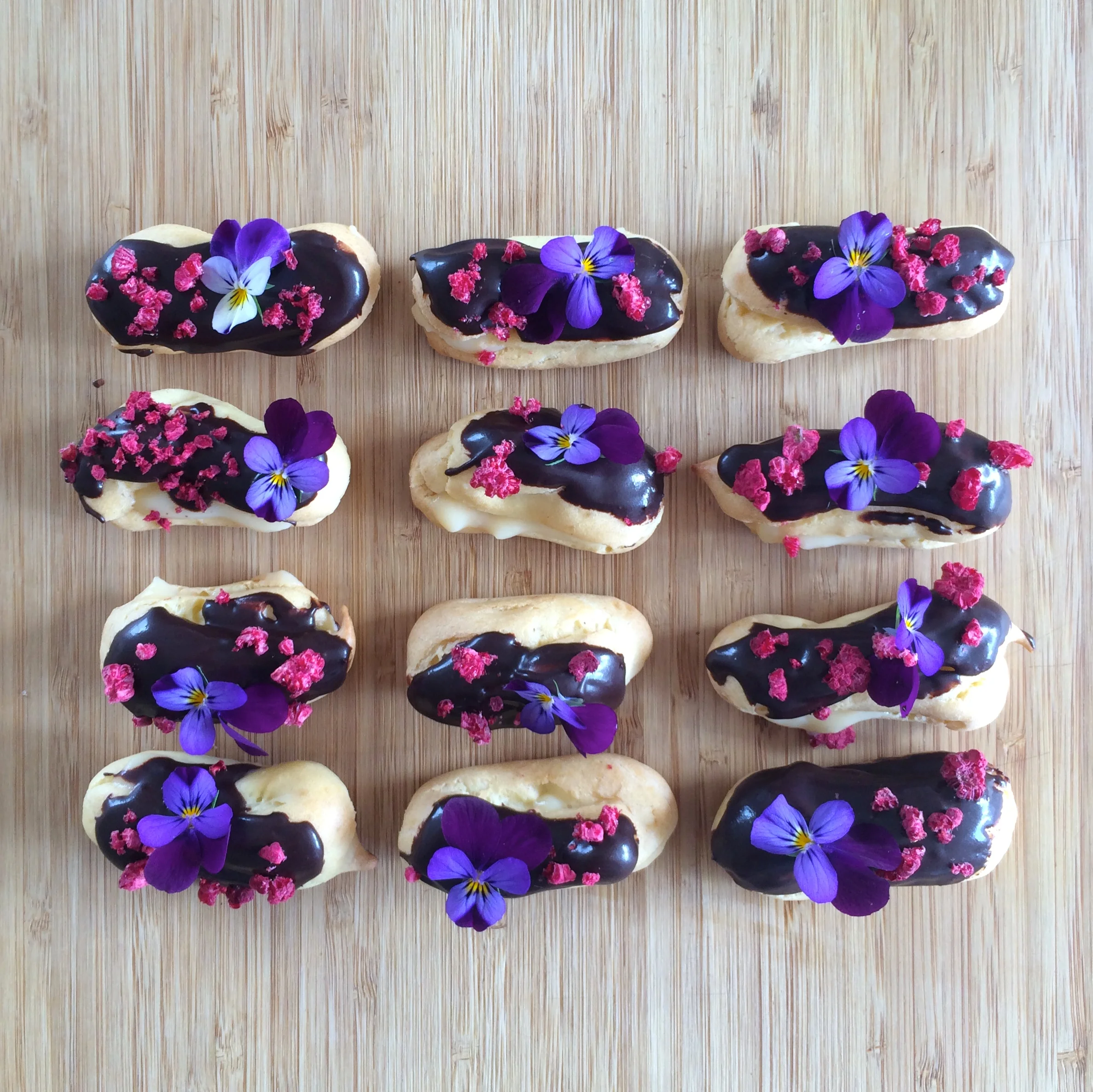 Using a piping bag, fill the eclairs with a line of cold custard. Carefully dip each eclair into the chocolate icing, use your finger to spread it around if it needs it. Decorate with a sprinkling of crushed, freeze dried raspberries and a flower. Keep refrigerated until serving time.