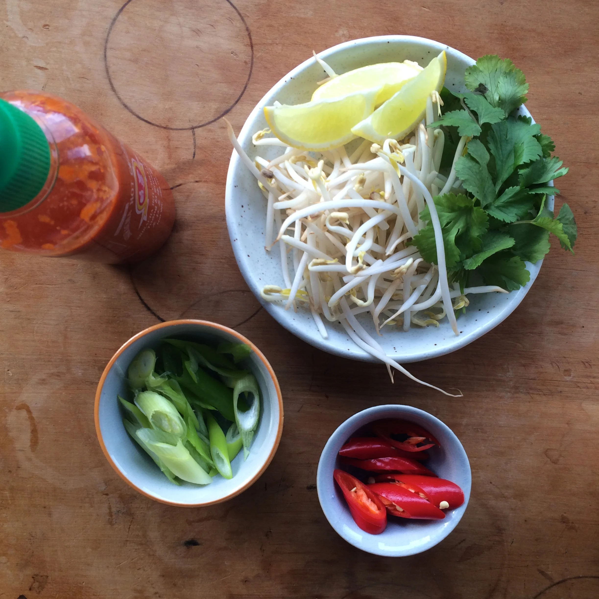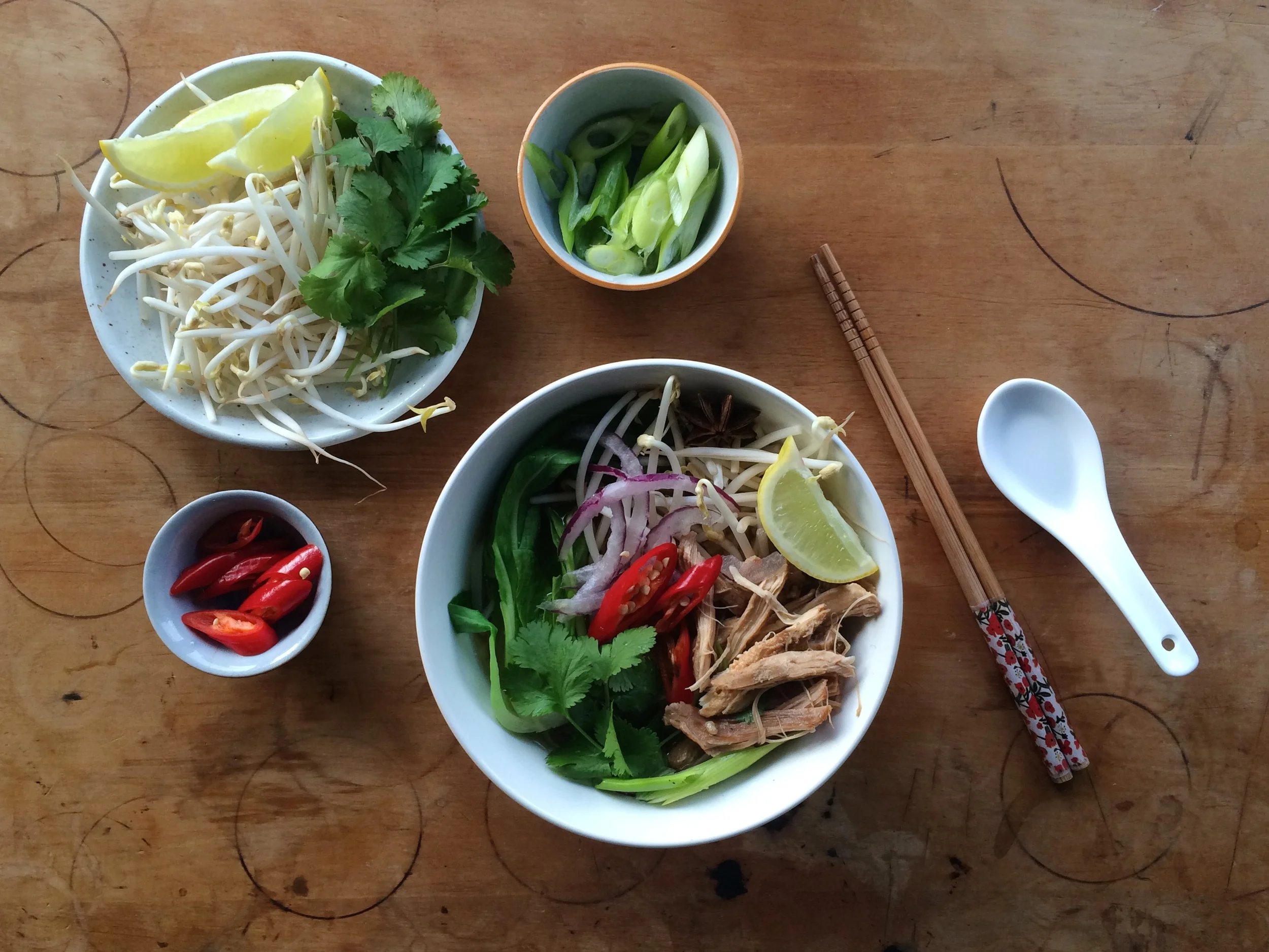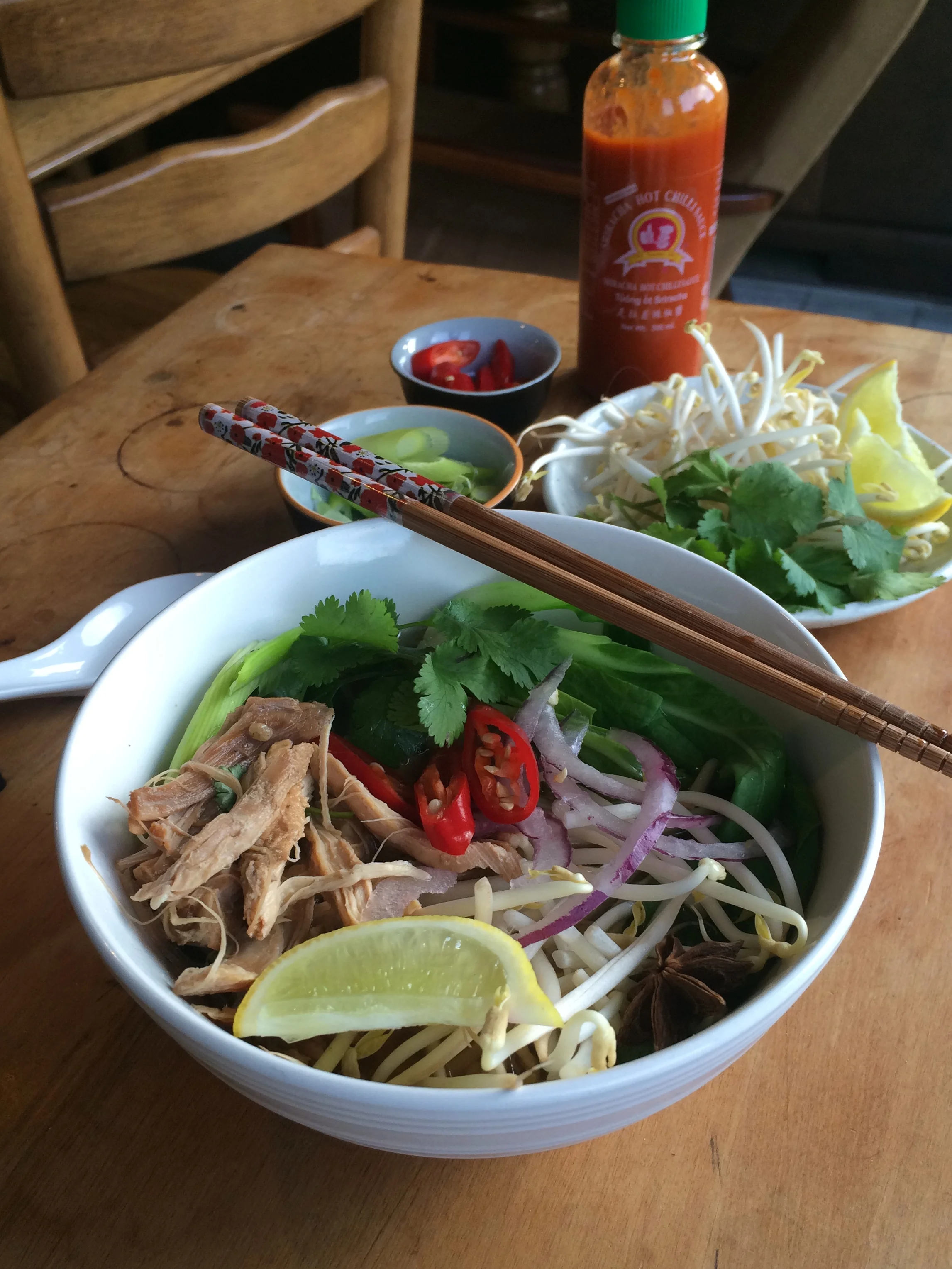 Warm up your broth and your chicken meat (if you let it to cool). Bring a small saucepan of water to the boil and cook your rice noodles for a few minutes until al dente. Strain the noodles and divide between the bowls. Bring another pan of water to the boil and cook for bok choy halves for a minute until they turn a bright green then strain and place into the bowls alongside the noodles. Divide the chicken between the bowls as well before pouring over the broth. Make sure you add almost two cups to each bowl so that it comes up well above the noodles. Top each bowl with the mung bean sprouts, fresh coriander, chilli, red onion, spring onion and a squeeze or two of lime juice.