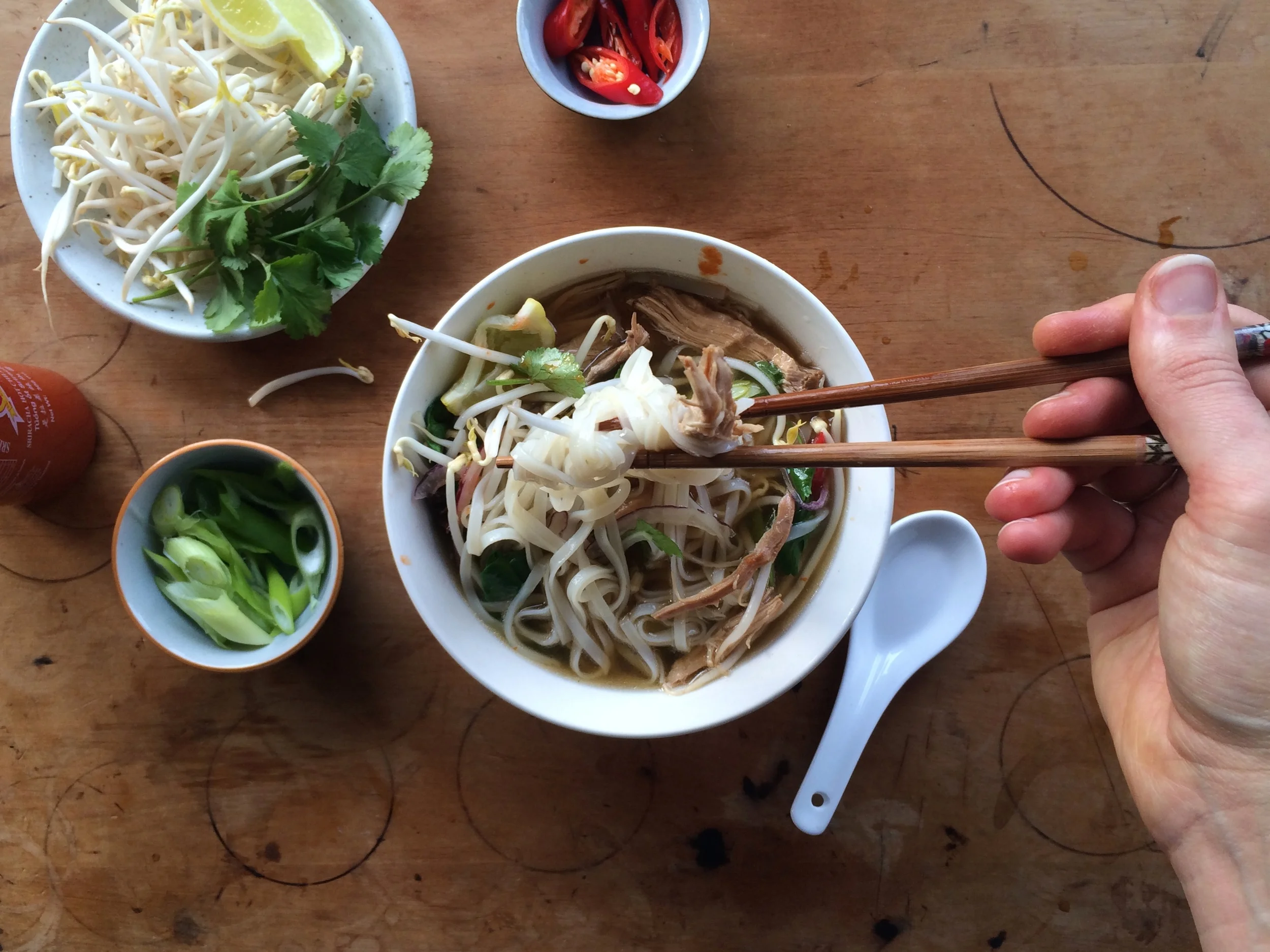 Pick at the bones, removing as much meat as you can, shredding it into pieces as you go. Keep this meat stored in the fridge until you want to serve your pho.