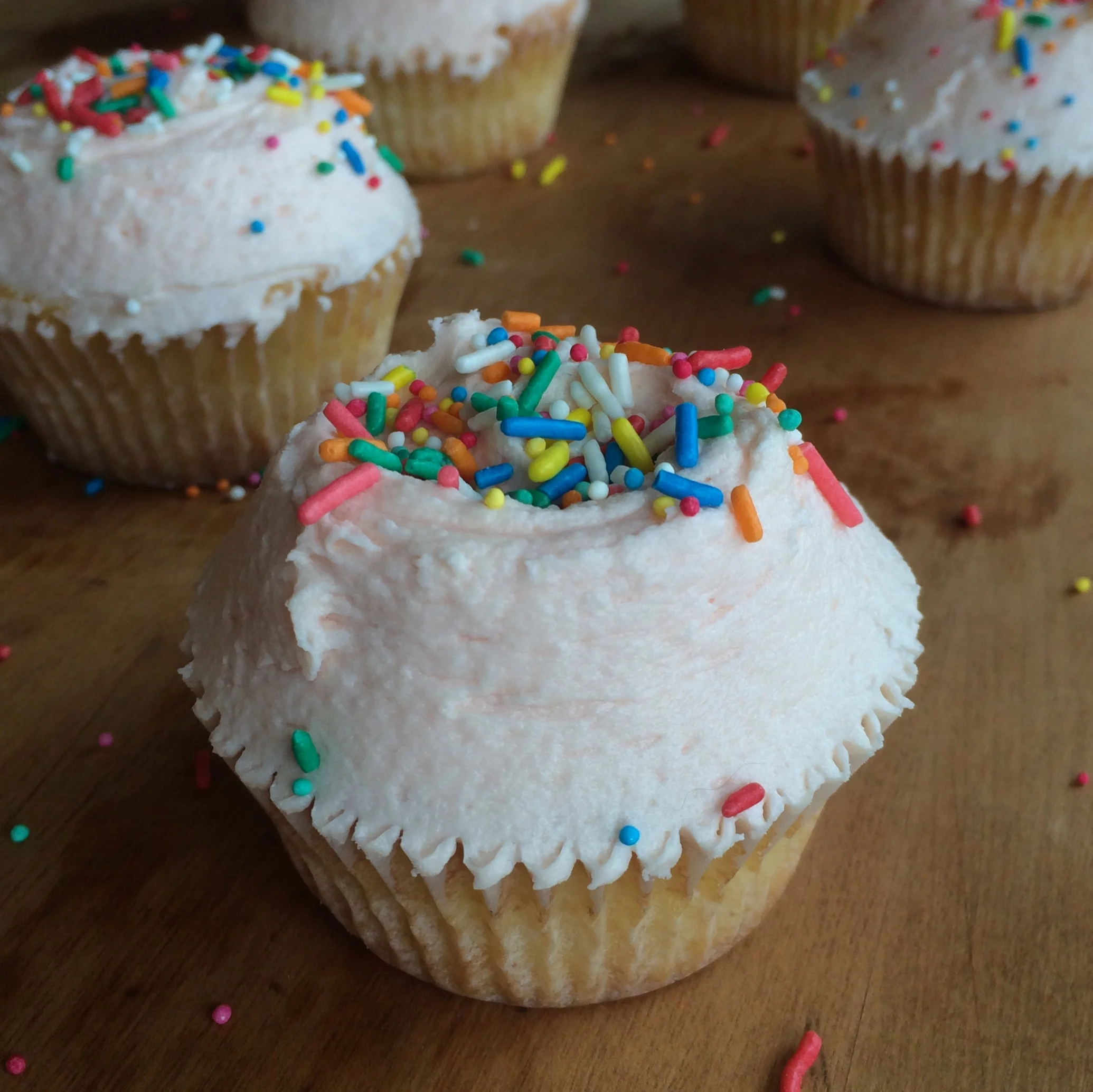 Spoon a couple of tablespoons of buttercream onto each cupcake and spread it evenly over the top. Watch this video here if you want some buttercream piping inspiration :) Finish off each cupcake with a sprinkle of sprinkles!